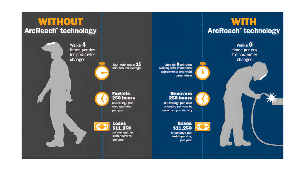 - No heavy control cords: Traditional cords can weigh 45–50 lbs and require extra handling. ArcReach technology allows weld cables to control parameters on feeders , cutting setup time, reducing cable wear, and lowering replacement costs.